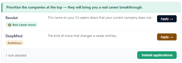 We match your background against top companies and show you where you have the strongest chance — ranked by career value.