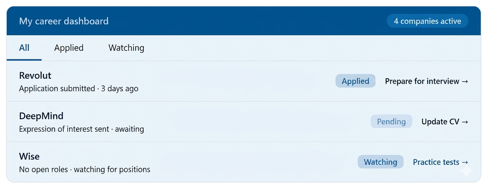 Your dashboard becomes your career command centre — every company you have engaged with, its current status, and the tools you need to move forward.