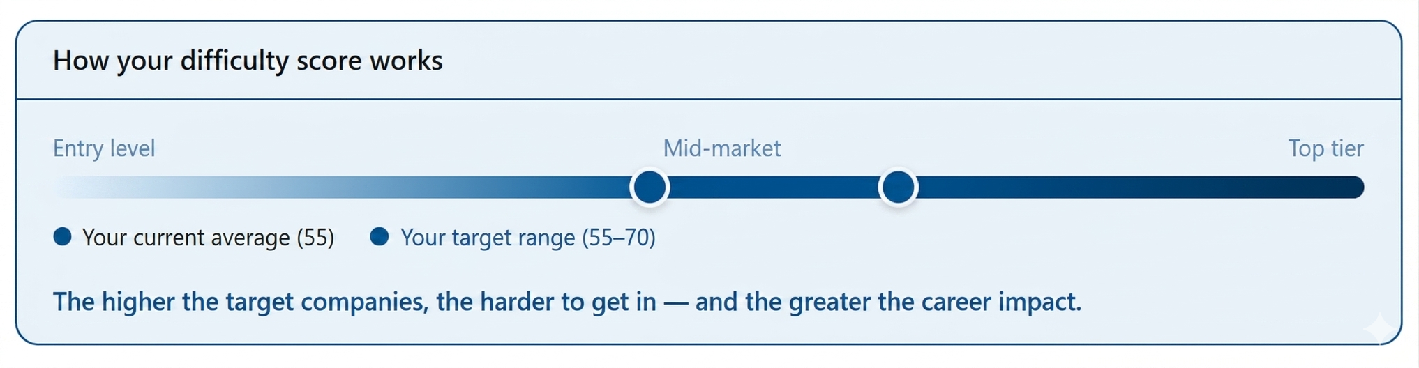 Our AI reads your work history and calculates your average company difficulty score over the past 36 months — based not on your job title, but on the actual calibre of the organisations you have worked in.